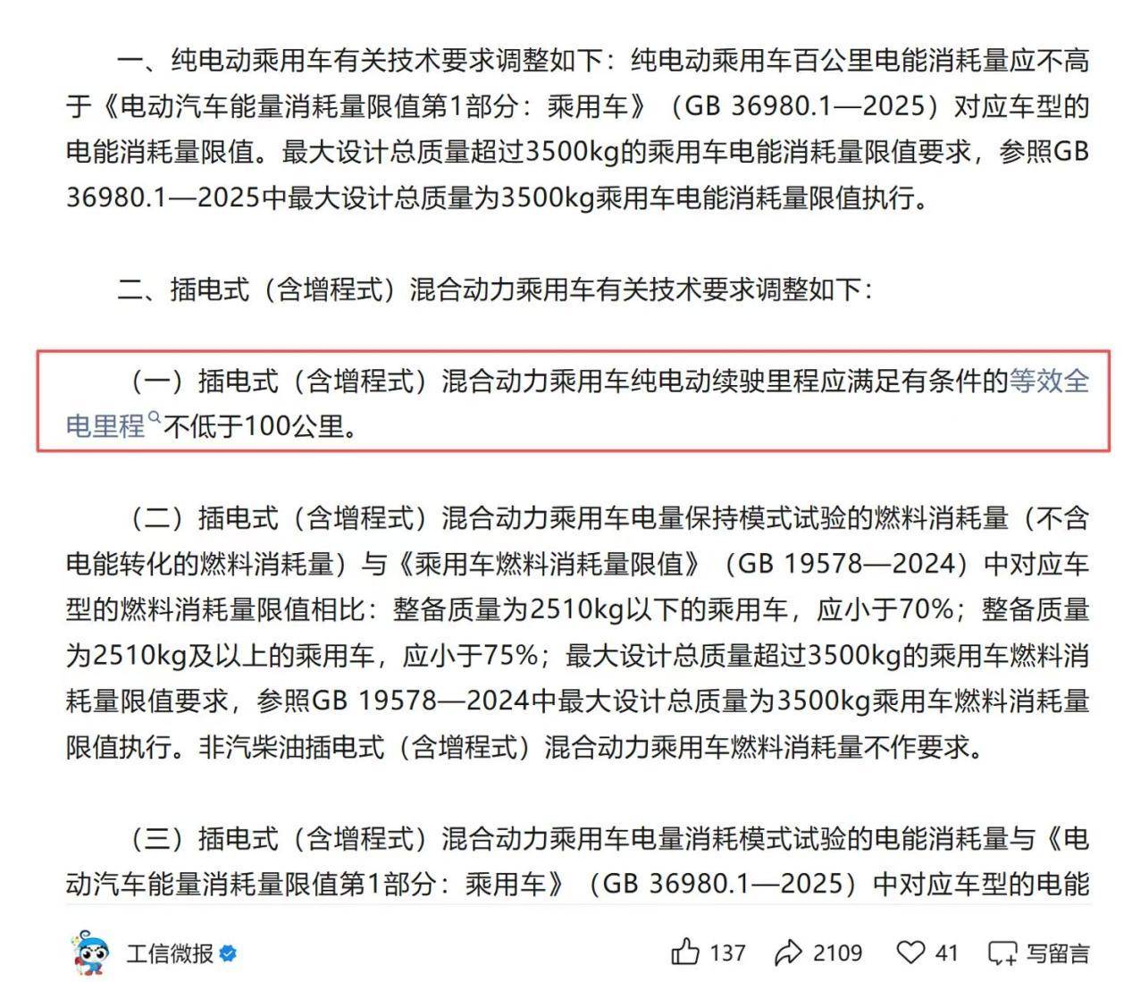 通过相关政策的调整,我们可以清晰的知道:长续航、低能耗,将成为插混车必备的“标签”。所以如果插混车的纯电续航不足100KM,不仅购车时不享受购置税减免政策,日常也还需要频繁切换“油电模式”,不仅影响了驾驶体验,还增加了出行成本。