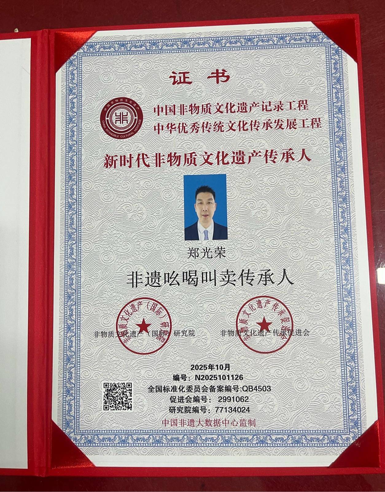 郑光荣的努力获得了广泛认可。"新时代非物质文化遗产传承人"这份荣誉,既是对他个人付出的肯定,也是对吆喝叫卖这项传统艺术在当代传承与发展的见证。在他身上,我们看到了非遗传承人的坚守与创新,正是这种精神,让古老的吆喝艺术成为连接传统与现代的文化桥梁。