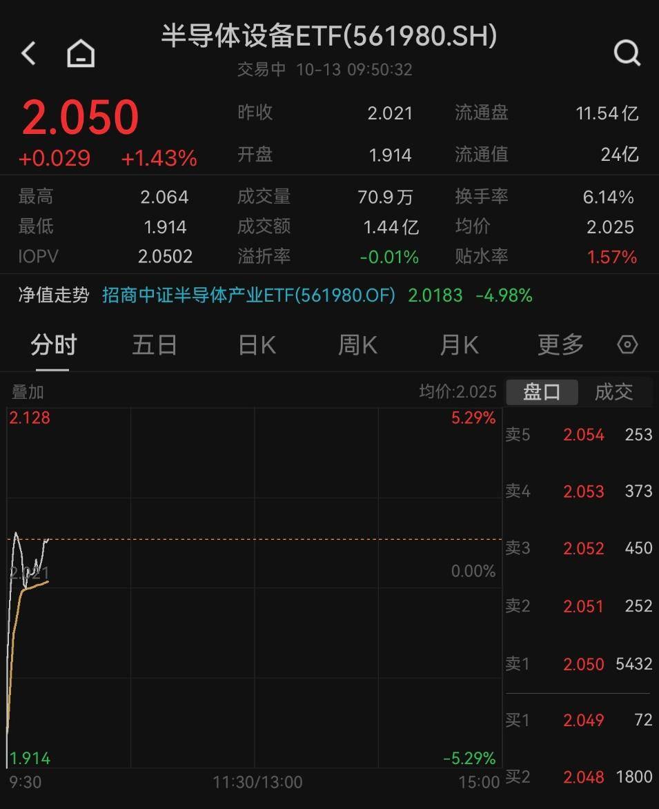 10月13日,受中美贸易摩擦影响,三大股指悉数大幅低开。盘面上半导体盘前跌幅居前 ,开盘后板块快速拉升。半导体设备ETF(561980)强势翻红,截至发文涨幅1.43%,日内振幅高达7.42%,成交额快速逼近1.5亿元。