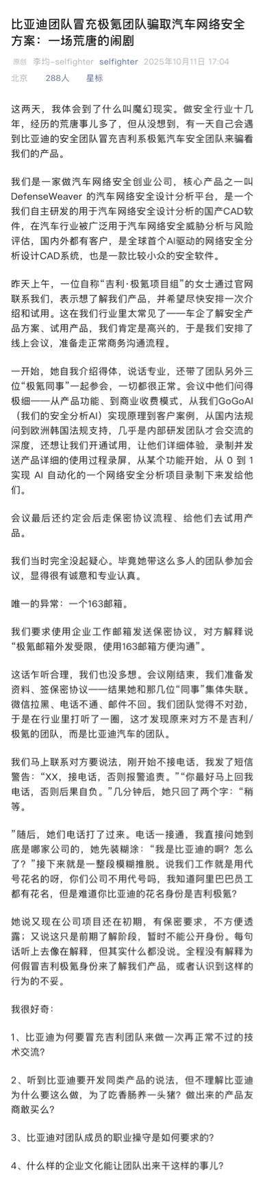 昨天看到一篇名为《比亚迪团队冒充极氪团队骗取汽车网络安全方案:一场荒唐的闹剧》的文章,感觉这个团队太卑鄙了,如果《文章》所述为事实,那么比亚迪或面临一场涉及违反多部法律的诉讼。