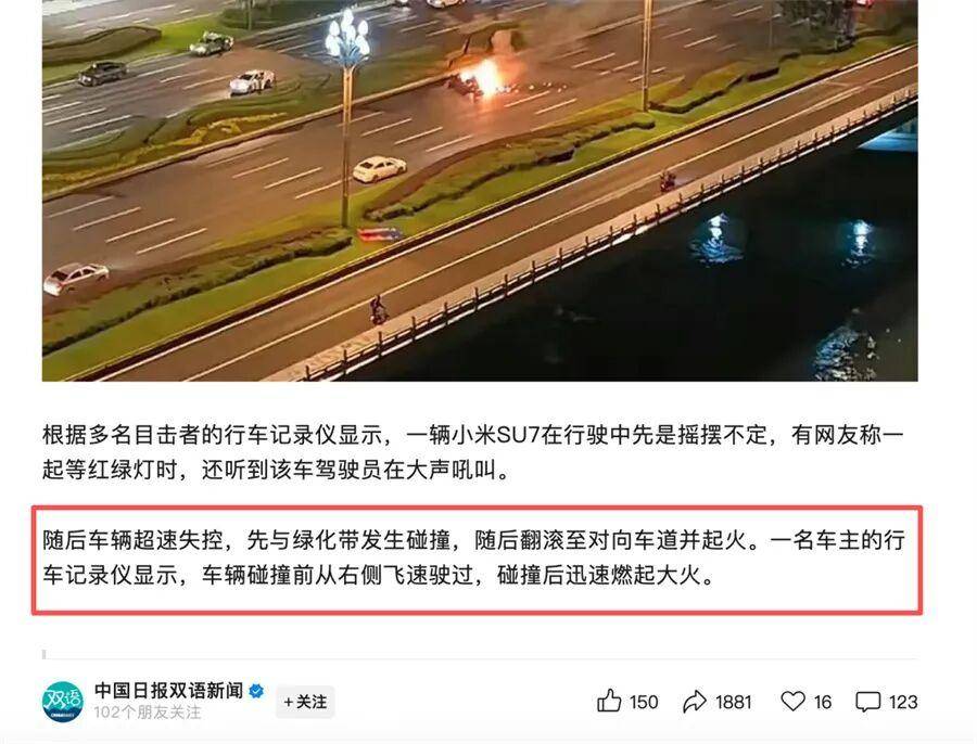 至于留给救援人员的“窗口期”,就此次事故而言,《中国日报双语新闻》在报道中提到:“车辆超速失控,先与绿化带发生碰撞,随后翻滚至对向车道并起火。一名车主的行车记录仪显示,车辆碰撞前从右侧飞速驶过,碰撞后迅速燃起大火。”