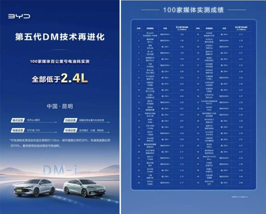 第五代DM技术再进化,此前经过百家媒体实测,秦LDM-i和海豹06DM-i车型的实测百公里亏电油耗全部低于2.4L,比权威机构认证的2.6L还要低,从实测可以看出第五代DM技术进化后更省了。