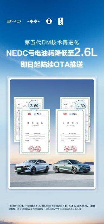 比亚迪第五代DM技术亏电油耗低至2.6L,正式开启OTA推送