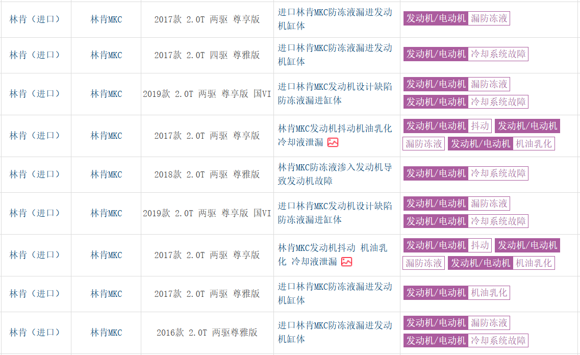 看完之后,只能说好家伙啊,一个豪华汽车品牌的百万旗舰车型,涉及这么多年款的车型都存在质量问题,几乎等同于全军覆没,这放在汽车行业中都极为罕见。然而这还没完,出现质量问题的车型,不只有百万级的领航员,诸如林肯MKC的防冻液漏进缸体也存在大量投诉。