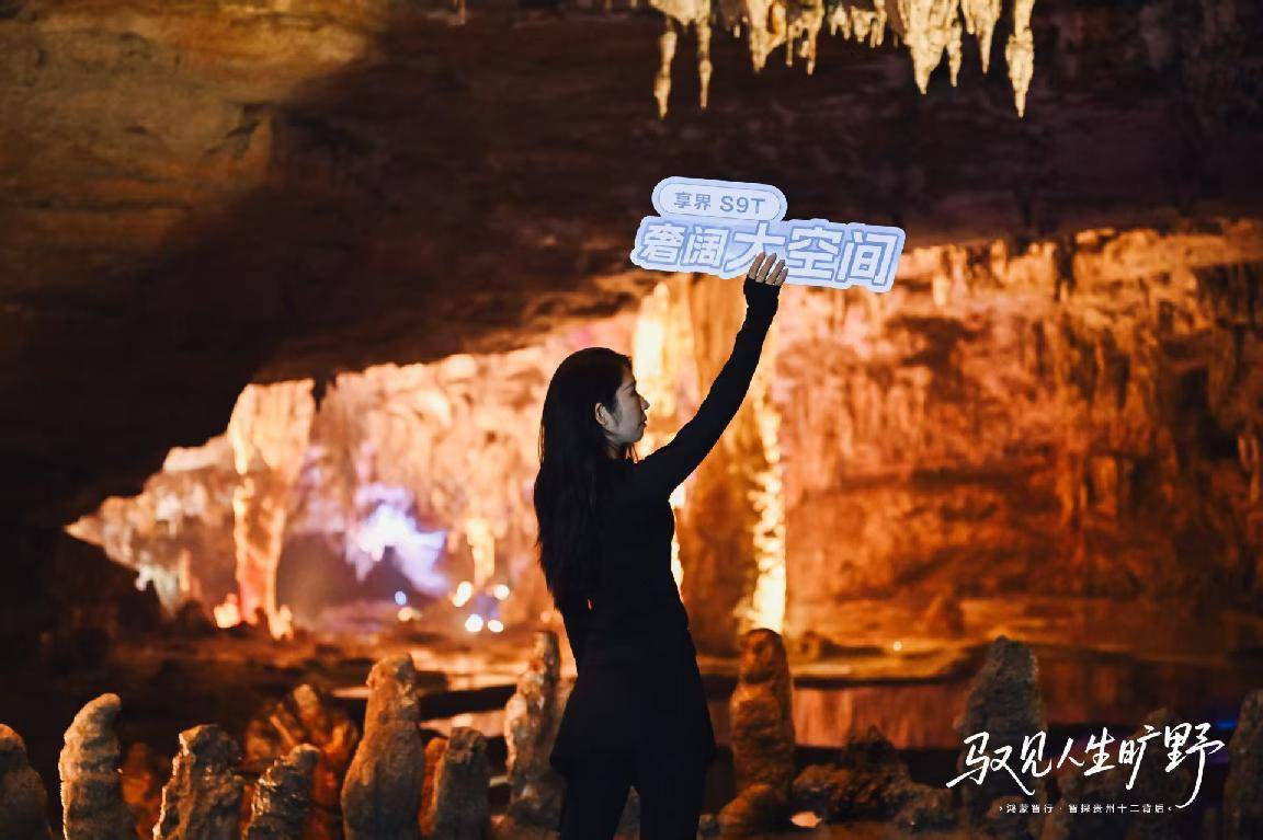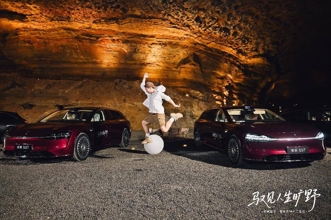 在主展区,享界S9T极具未来感的光语设计,在洞内探照灯的映射下,与瑰丽的岩壁光影交织,宛如一件置于自然美术馆中的艺术品,瞬间成为全场最瞩目的打卡点。