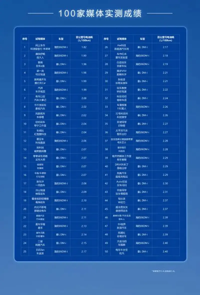 第五代DM技术再进化,此前经过百家媒体实测,秦L(参数|询价) DM-i和海豹(参数|询价)06DM-i车型的实测百公里亏电油耗全部低于2.4L,比权威机构认证的2.6L还要低,从实测可以看出第五代DM技术进化后更省了。