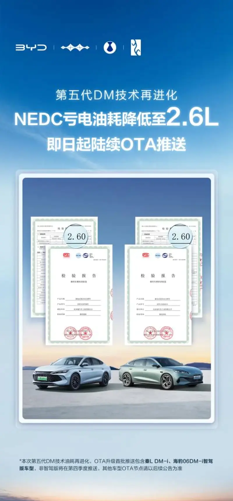 比亚迪第五代DM技术再进化,即日起陆续OTA推送。升级后,NEDC百公里亏电油耗进一步降低10%,低至2.6L,再创全球百公里亏电油耗新低,让用户能够享受更低的油耗体验,赚取科创红利带来的真金白银!