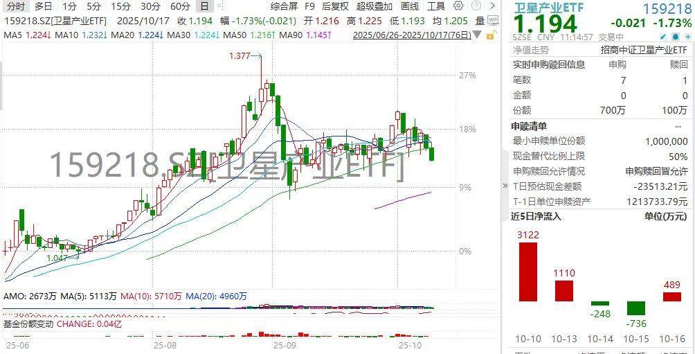 10月17日,卫星产业板块整体调整,截至11时7分,卫星产业ETF(159218)下跌1.65%。成分股走势分化,中国卫星逆势上涨0.40%,成为前几大权重股中唯一收红标的,航天电子、华测导航、中国卫通等均有不同程度下跌。