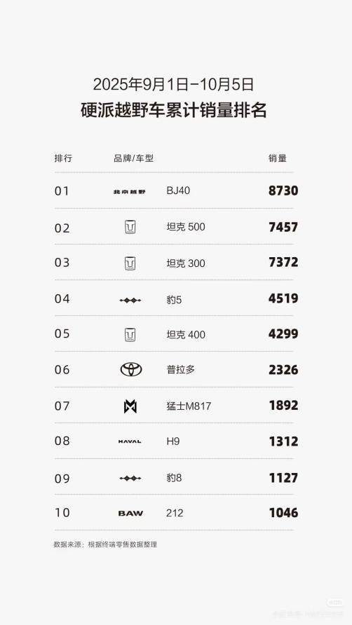 作为双方联合打造的首款车型,猛士M817已实现销量与口碑双丰收:预售1小时内突破9713台,上市5小时大定订单超3700台,并且自8月上市以来,不仅口碑位列同级第一,更成功跻身豪华新能源越野第一阵营,9月1日-10月5日,以1892台的成绩居硬派越野车累计销量排名第七,成为智能越野赛道的现象级产品。