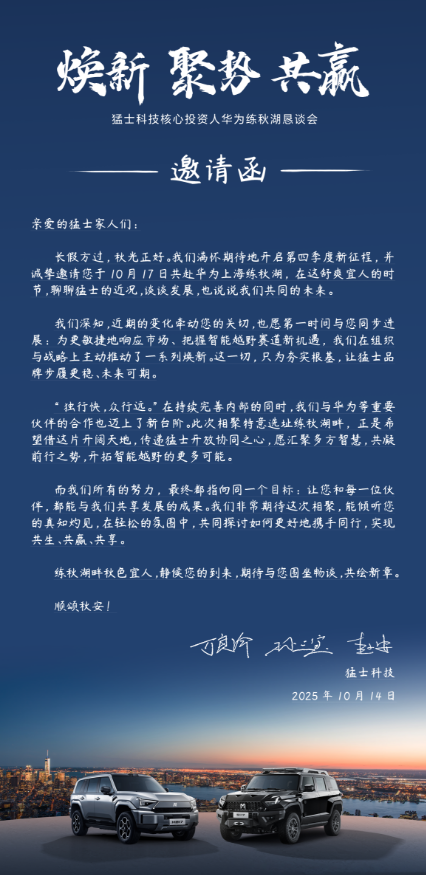 练秋湖之约的选址本身,就是猛士与华为深化合作的明确信号。从2024年战略合作协议签署,到2025年猛士M817上市,双方仅用一年多的时间便完成从理念协同到产品落地的跨越,如今合作正从技术采购转向生态共建。