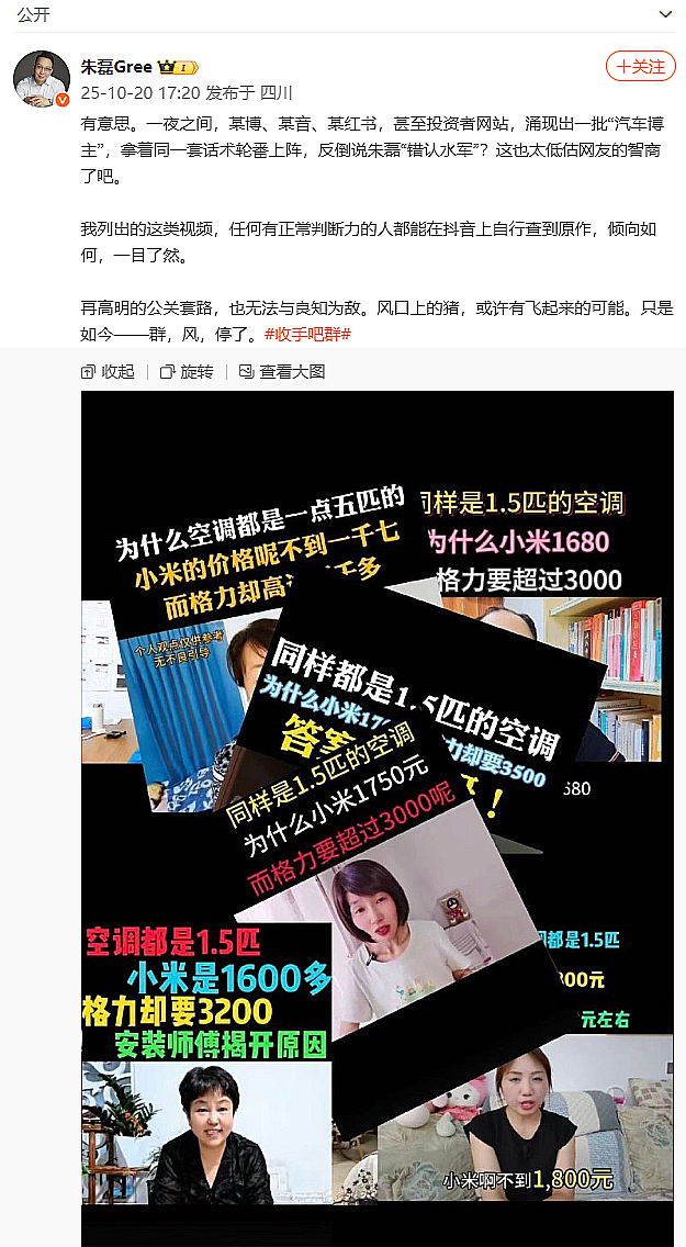 格力朱磊发文质疑汽车博主黑公关,汽车博主关注空调产品相当反常