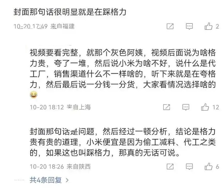 仅看标题似乎是一些偏爱小米产品的汽车博主对格力产品进行了不友好的评价,但细看评论和一部分相关视频内容的话,结论可能恰恰相反。