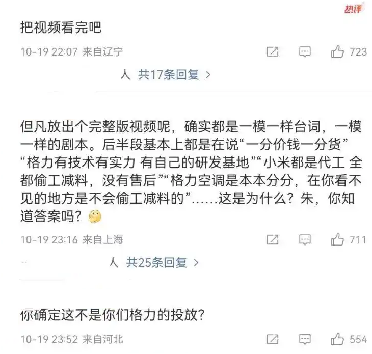 “一夜之间,某博、某音、某红书、甚至投资者网站,涌现出一批‘汽车博主’,拿着同一话术轮番上阵,反倒说朱磊‘错认水军’?这也太低估网友的智商了吧。”这样的疑问确实令人难以解答。所谓有图有真相,朱磊贴出的图片确实是统一话术的样子,而且均明确提及小米和格力两个品牌;此类博主的行为有明显拉踩的嫌疑,涉嫌黑公关,换位思考,格力方面显然不会坐视不管。