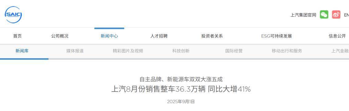 改革见效,实实在在地落在市场曲线上。2025年1—8月,上汽实现销量八连涨,8月单月批售36.3万辆,同比增长41%,成为国企阵营中的“唯一正增长”。自主品牌更是表现抢眼,1—8月累计销量同比增长近50%,新能源销量达到76.4万辆,同比暴涨49.9%。