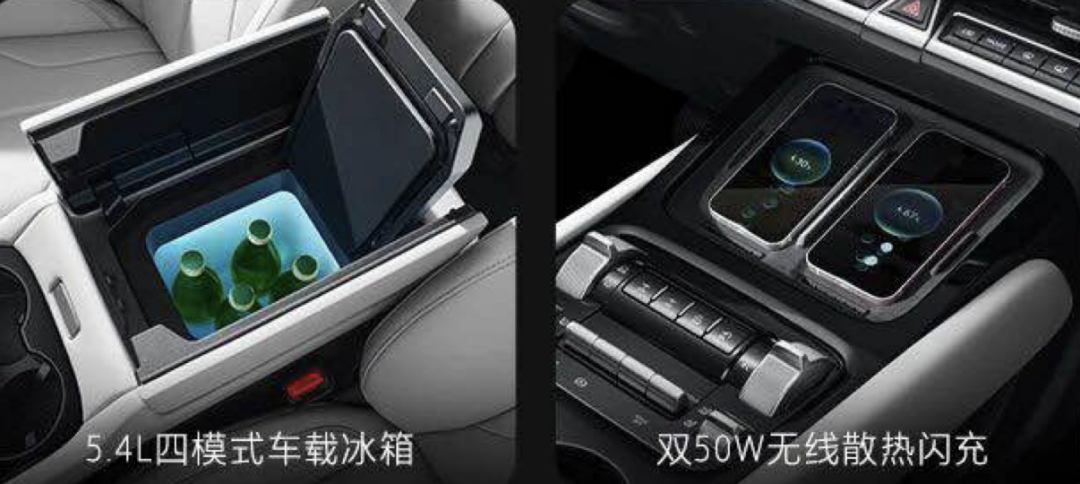 细节设计方面,采用了怀挡式换挡机构,提供了更宽敞的中控空间,配备双50瓦无线充电面板可同时为两部手机快充,中央扶手箱内的5.4升车载冰箱支持-6℃至50℃温控,长途穿越时能随时喝到冰饮或热饮。