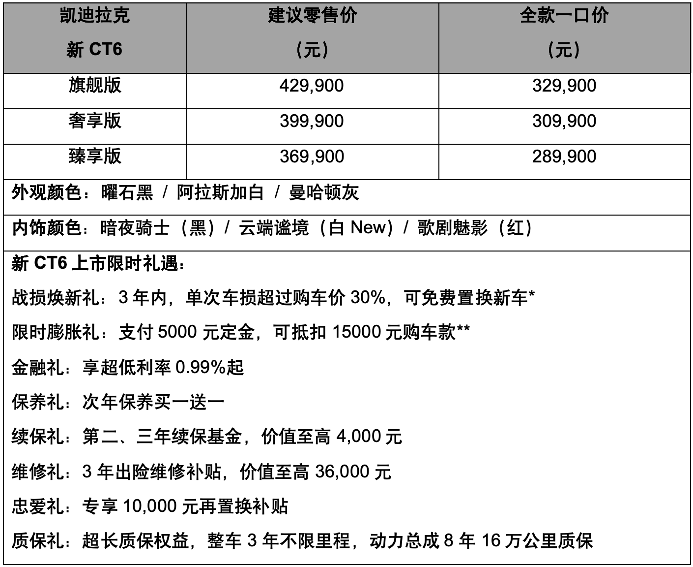 新CT6优化配置结构,精简为臻享、奢享、旗舰三款车型,配置全面升级,全款一口价28.99万元起。同时,新CT6重磅推出备受用户好评的“战损焕新礼”——单次车损超过购车价三成可置换等价新车,目前已有超过60位凯迪拉克车主享受该权益。不仅有未来的安心保障,凯迪拉克更带来了当下可享的诚意,即日起至“双十一”,用户可享5000元定金抵15000元购车款的限时膨胀礼遇。