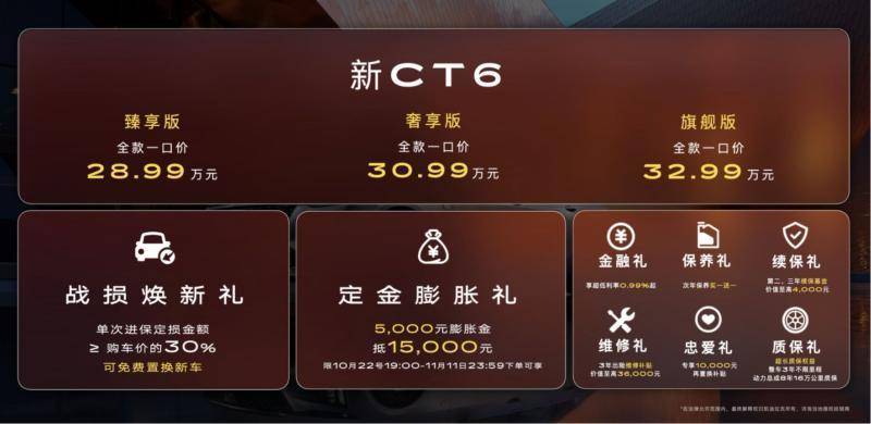 (2025年10月22日)今日,凯迪拉克以创新虚拟现实技术发布百万级磁浮底盘,搭载该底盘的全尺寸旗舰轿车凯迪拉克新CT6也同步正式上市。新CT6优化配置结构,精简为臻享、奢享、旗舰三款车型,配置全面升级,全款一口价28.99万元起。同时,新CT6重磅推出备受用户好评的“战损焕新礼”——单次车损超过购车价三成可置换等价新车,目前已有超过60位凯迪拉克车主享受该权益。不仅有未来的安心保障,凯迪拉克更带来了当下可享的诚意,即日起至“双十一”,用户可享5000元定金抵15000元购车款的限时膨胀礼遇。不仅如此,新CT6还带来了忠爱礼、续保礼、金融礼、保养礼等八大权益。凯迪拉克新CT6诞生于品牌专属旗舰豪华后驱平台,不仅搭载百万级磁浮底盘,更融合品牌先锋设计语言与极致豪华细节,为用户带来顶级驾驶乐趣与越级乘坐体验。即刻下定凯迪拉克新CT6,解锁专属百万级豪华奢享新境!