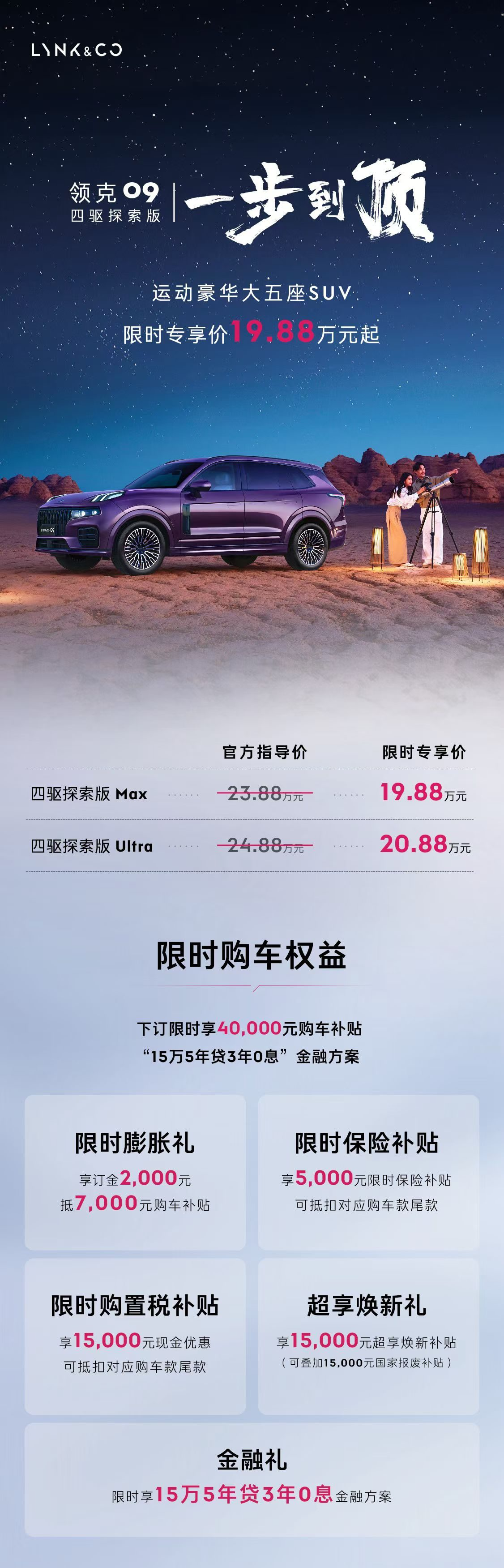 解锁全场景豪华!限时19.88万起,2026款领克09四驱探索版上市