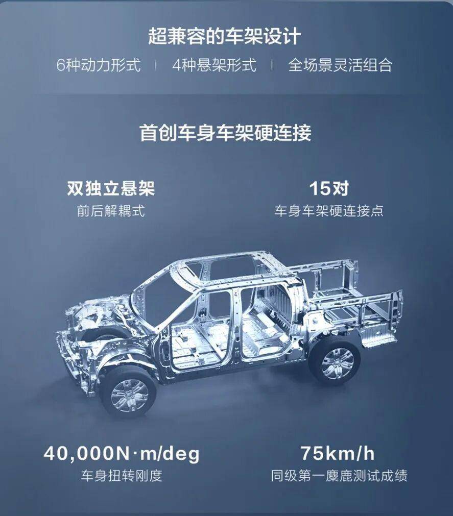 2025年,上汽商用车凭借两大技术平台与安全突破构建产品竞争力。“星栈平台”作为超级全栈越野平台,集成星湃动力与全球首创星桥架构,73%高强度钢车身配合山海底盘、星云驾舱,显著提升皮卡产品实力。中国首款柴油超级混动底盘“新途远界”,实现C-WTVC工况超1000km续航与3500kg后桥承载,为房车/冷链改装提供理想解决方案。