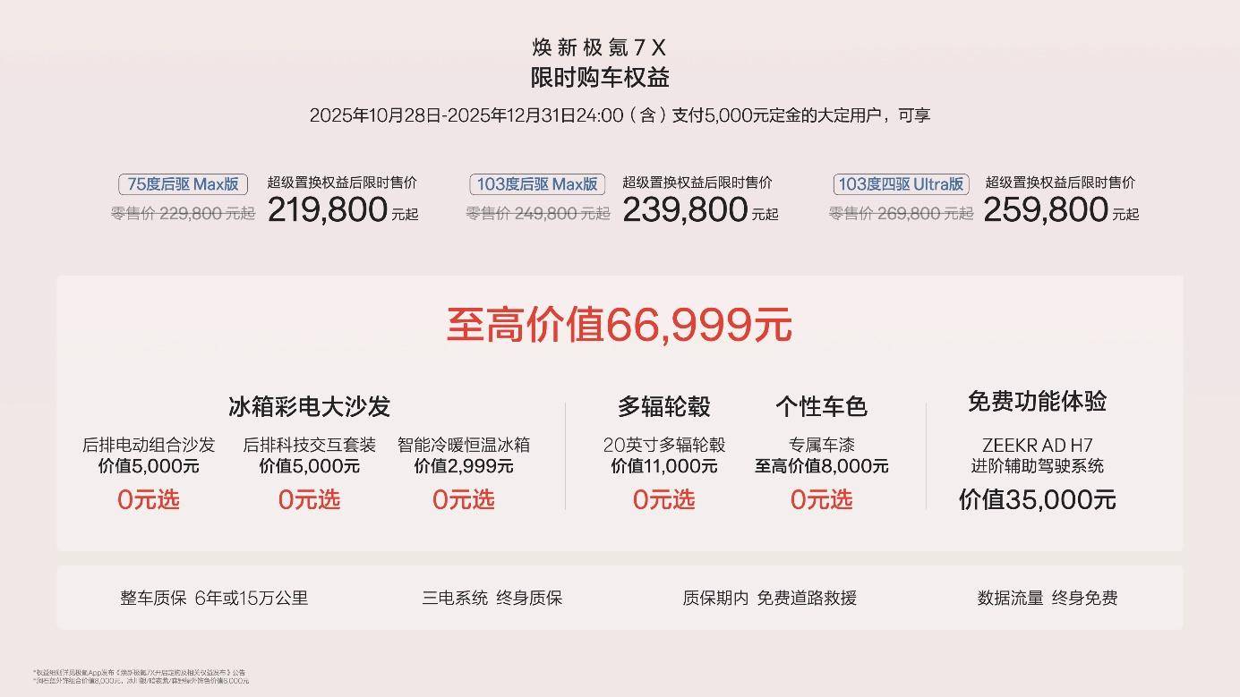 2025年10月28日至12月31日(含)期间支付5,000元定金的大定用户,全系赠送价值12,999元的冰箱彩电大沙发,全系免费升级20英寸265mm宽胎以及专属车漆,并可享价值35,000元的ZEEKR AD H7进阶辅助驾驶系统终身免费功能体验。 与此同时,首任极氪老车主增换购焕新极氪7X可享每年1000度的5年免费充电权益。此外,2025年11月30日(含)前,下定且锁单的用户,如因极氪原因,无法在2025年开票交付,导致无法全额享受购置税优惠,对于政策退坡产生的差额,极氪品牌提供至高13,500元的购车尾款抵扣。