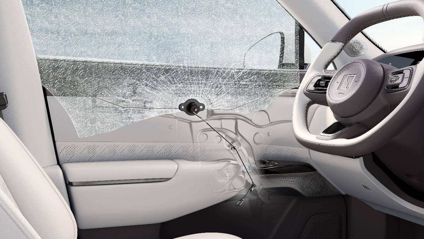 值得一提的是,区别于普通双层夹胶玻璃,焕新极氪7X采用外层3.5mm钢化玻璃+0.76mmPVB胶膜+内层1.1mm钢化玻璃的设计,表层压应力和内部张应力形成力学平衡,主驾安全破窗器可以轻松击穿。