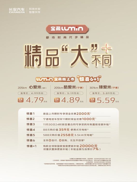 10月30日,都市时尚代步精品,Lumin宝藏版正式上市,共推出心爱米、酷爱米、臻爱米三个配置,官方惊喜价4.79万元-5.59万元。为回馈用户,Lumin同步推出极具诚意的“惊喜6+1”大礼,购车门槛大幅降低。