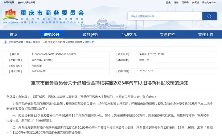 10月28日,重庆市商务委发布最新消息:重庆市12月新增1.3亿元汽车置换更新专项补贴。