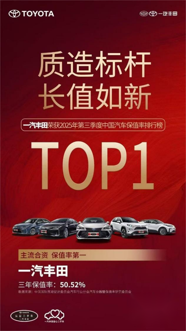 长期主义展示在一汽丰田在产品可靠性等关键领域下足了功夫,就如马拉松大赛对保障用车的首先要求就是要绝对安全可靠。成立22年来,一汽丰田始终坚守“品质保障”的金字招牌,将对品质的严苛管理注入每一个生产环节,不仅保证不良产品“不流向用户”,更严苛到不流入“下一个工序”。也因此,一汽丰田的每一款车都自带高品质、高耐久性、高可靠性的QDR属性,成为用户跨越时间周期的品质之选,并保持着极高的保值率,在贸促会汽车分会发布的2025第三季度汽车保值率排行榜中,一汽丰田以三年保值率50.52%的成绩,荣膺主流合资品牌第一名。