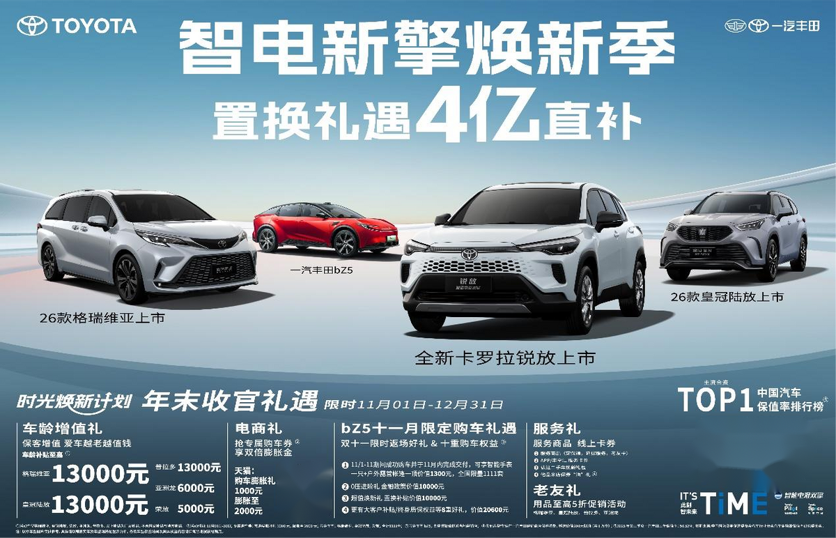 不止如此,为回馈用户厚爱,一汽丰田年末收官礼遇再升级,以4亿元厂家直补正式开启“智电新擎焕新季”。11月1日-12月31日,皇冠陆放、格瑞维亚、普拉多等重磅车型可享至高1.3万元的车龄增值礼;购全新bZ5更有限时购车福利赠送,此外“焕新季”还准备了电商礼、老友礼、服务礼等多重大礼,以极致诚意为用户创造最佳购车时机。