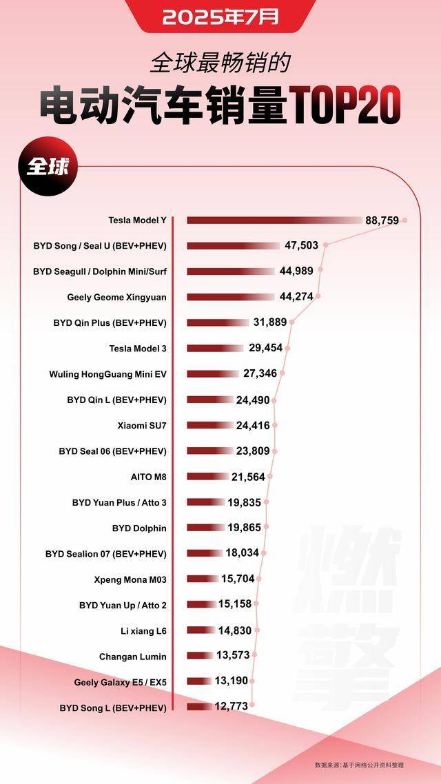 2025年7月全球电动车最畅销榜单呈现三大核心特征: