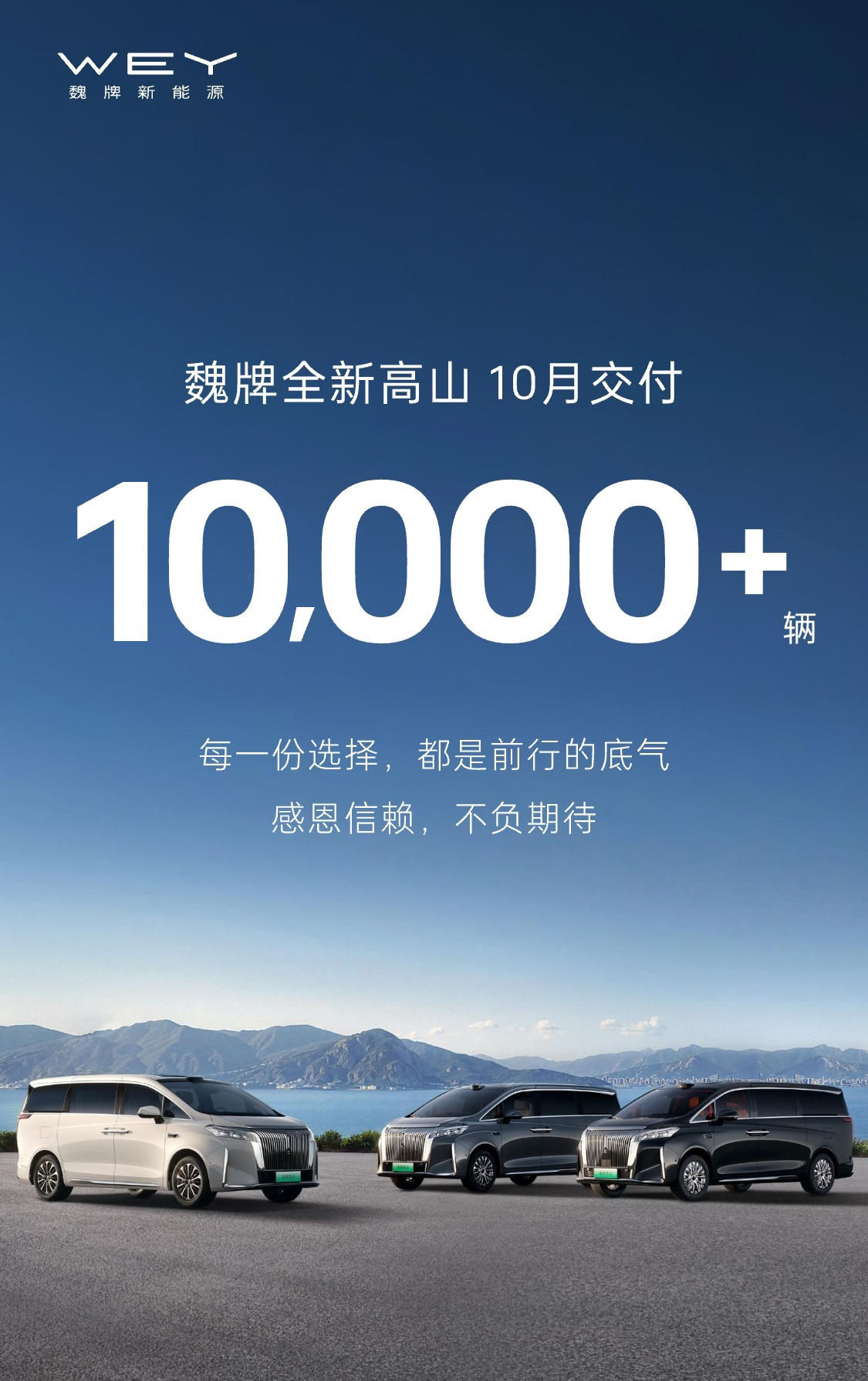 今年以来,高山、蓝山销量持续走高,推动魏牌重返主流赛道。全新高山家族数次成为新能源 MPV 周销榜冠军,蓝山累计交付突破 10 万,成为第三台交付破 10 万台的新能源大六座 SUV。2025 年 10月,魏牌以 12699台的月销量再创历史新高!
