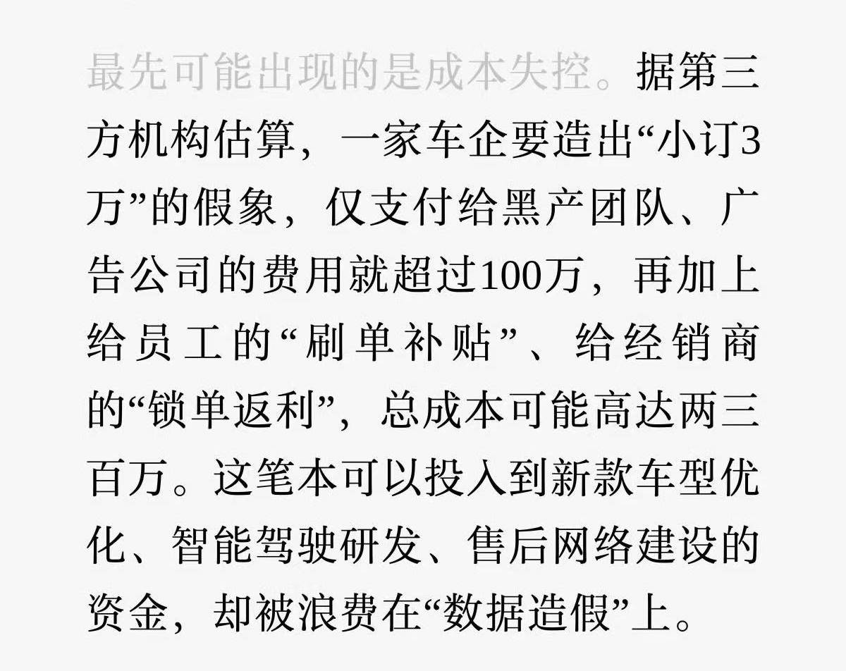 日前,有博主曝料称,根据第三方机构的估算,一家车企想要造出“小订3万”的假象,光支付给黑产团队、广告公司的费用就超过了100万元,再加上给员工的“刷单补贴”、给经销商的“锁单返利”等费用,总成本可能高达两三百万元。所以订单造假不仅需要耗费比较高的成本,而且从厂家到广告公司到员工,再到经销商,几乎涵盖了一辆车从生产到宣发到销售的全链路,而这个过程中,所有环节都参与了造假,这才是问题的关键。