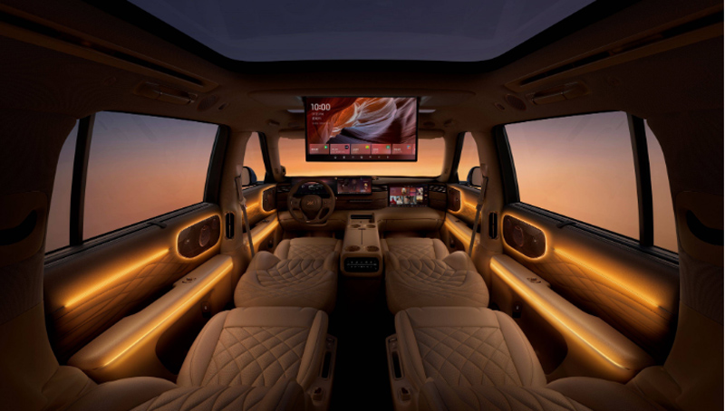 外观尺寸达到5279/2000/1806mm,轴距3160mm,星环式贯穿灯带、T字形灯组等辨识度极强的元素,大饼轮毂、隐藏式门把手等,内部空间充裕,豪华感倍增,前排三块大屏内置先进的车机系统,后排液晶大屏提供娱乐视听,令同级竞品有点招架不住。超级增程混动系统搭载1.5T引擎与电动机组合,配备66kWh电池组,纯电续航超450公里,综合续航超过1500公里,同时加持灵蜥数字底盘3.0。
