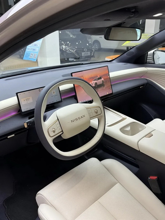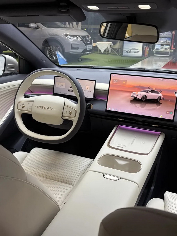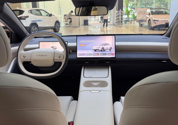 坐进车内,N6的座舱堪称N7的“科技复刻版”。15.6英寸2.5K悬浮大屏与全液晶仪表盘组成信息交互主体,搭载NISSAN OS系统,支持AI助手小尼和多元生态应用。双层环抱式座舱配合256色漫反射氛围灯,营造出远超同价位车型的豪华感。