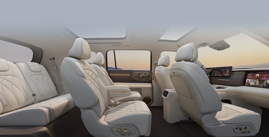 作为一款全尺寸的豪华旗舰SUV,智己LS9的车身长宽高分别为5279x2000x1806mm,轴距更是长达3160mm,全面领先友商的L9、M9等同级旗舰SUV,堪称移动大平层。同时,为了提升座舱舒适度,智己LS9也是在“偷空间”方面费尽心思,把座舱得房率做到同级领先的86%,这也就意味着它的三排六座布局,哪怕是大人坐在第三排也能轻松舒展肢体,真正实现三排平权。