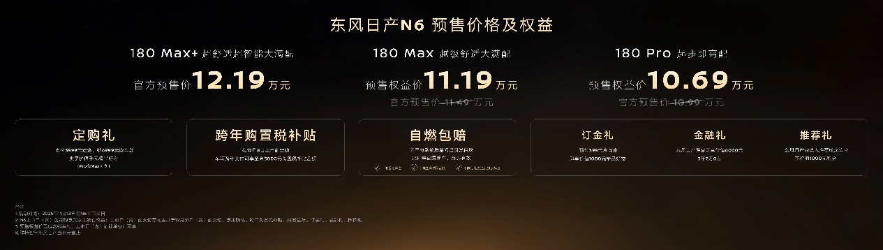 预售期间,客户还可享:支付3999元定金即可抵6999元购车款的“定购礼”;至高价值5000元的限时跨年购置税补贴;以及订金礼、金融礼和推荐礼等好礼权益,至高价值共计11000元。目前N6产能准备充足,11月内完成大定,即可实现12月8日上市即交付。