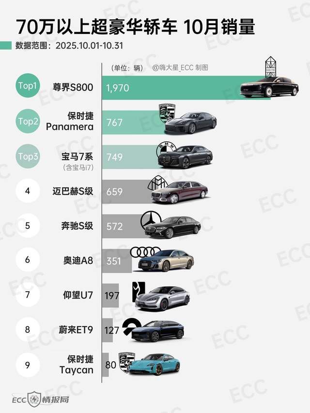 在此背景下,市场早已翘首以盼:期待一款能打破现有僵局、引领行业潮流的创新车型登场。而尊界S800的到来,恰好接住了这份期待。10月70万以上超豪华轿车市场的交付榜单中,尊界S800以1970台的成绩再度登顶,这份数据背后,是市场选择的直观体现。