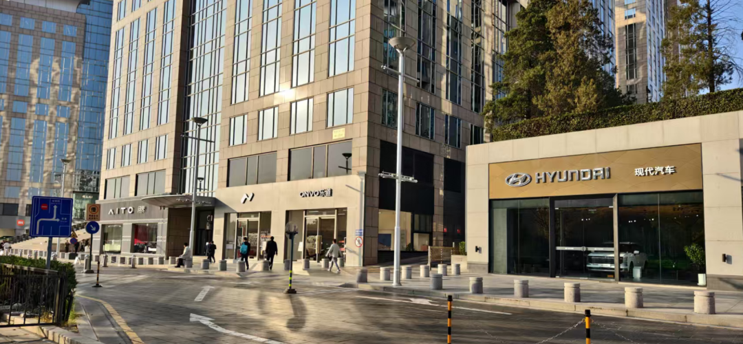 在北京王府井面向长安街的一侧商铺,现在几乎都已被各家汽车门店包揽。包括蔚来、乐道、小米汽车、AITO问界、现代汽车等直营店,还有红旗金葵花旗舰尊享中心。