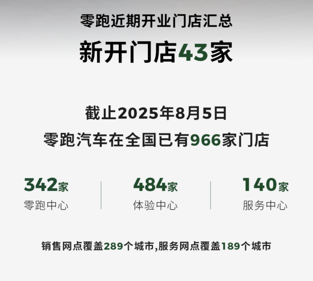截至2025年8月5日,零跑汽车在全国的门店总数已达966 家,包括342家零跑中心、484家体验中心及140家服务中心。其中经销商渠道占比70%左右。