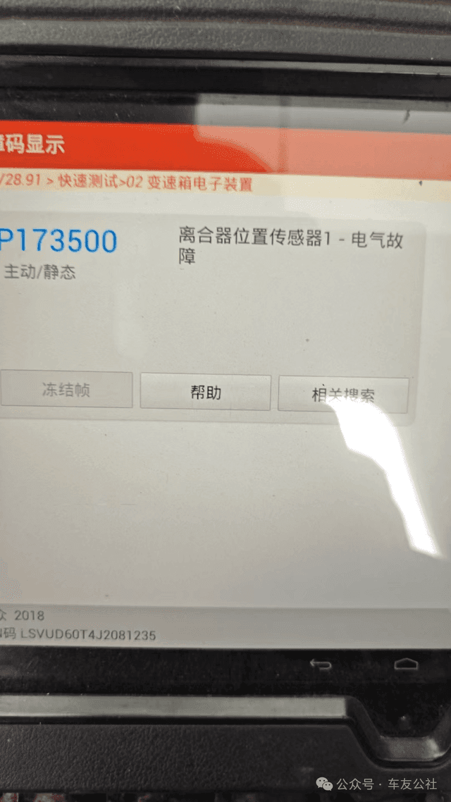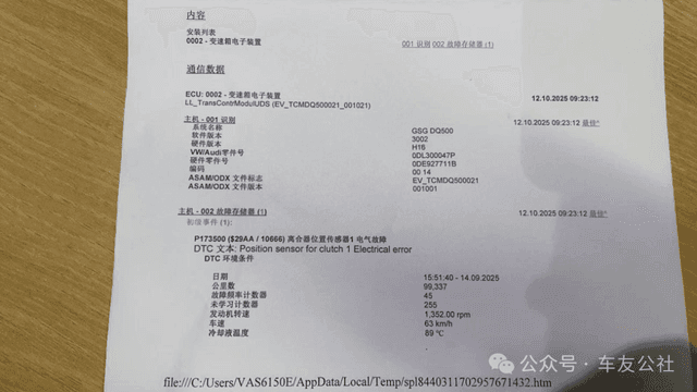 2025年10月5日,四川成都 2019 款途观 L 车主肖女士遭遇变速箱故障,车辆弹出紧急运行模式提示,故障代码为 P173500(离合器位置传感器 1 电器故障)。