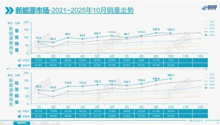 在大力发展新能源的当下,今年新能源渗透率也在逐步走高,已经从1月份的41.4%到9月份的顶峰57.9%,实现了8连涨,10月份的新能源车渗透率也仅略低于9月份。
