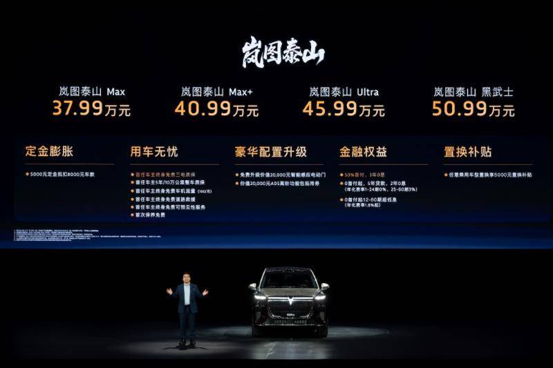 【2025年11月18日,深圳】11月18日,岚图汽车在深圳国际会展中心正式推出旗下全新力作——岚图泰山。共推出Max版、Max+版、Ultra版、黑武士版四大版型,官方指导价为37.99万元-50.99万元。同时,还公布了总价值4.8万元的上市尊享权益。