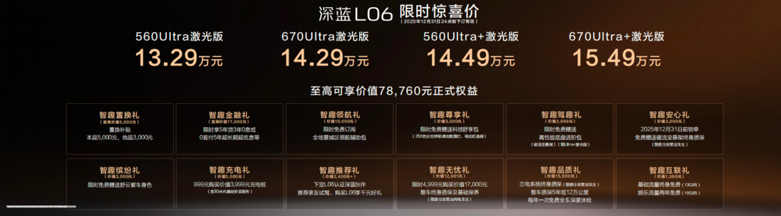 《车尚时刻》新媒体获悉,11月18日,“长续航磁流变激光智能轿跑”深蓝L06价格及权益发布。新车共推出四款配置车型,售价13.29万元起,同时推出至高价值78760元的购车权益,并承诺将为11月30日前锁单,且非客户原因导致跨年交付的用户兜底全部购置税,以极具诚意的姿态登陆15万级纯电市场。