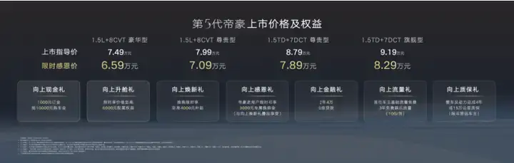 感恩400万,荣耀新篇章。第5代帝豪即日起推出7重上市礼遇,2025年11月30日前购车用户,可享包含1000元订金抵10000元购车金的向上现金礼;限时享价值至高6000元配置权益的向上升舱礼;换购限时享至高4000元补贴的向上焕新礼;帝豪老用户可享3000元专属换购金的向上感恩礼(与向上焕新礼叠加享受);2年4万0息贷款的向上金融礼;首任车主基础流量免费,3年免费娱乐流量(10G/月)的向上流量礼;整车及动力总成4年或15万公里质保(限非营运车主)的向上质保礼。除此之外,作为帝豪持续越级向上,给用户带来超越期待体验精神的延续,用户还可选装千里浩瀚辅助驾驶H3方案。第5代帝豪首次将包含行车、泊车、安全三大维度的高阶辅助驾驶系统带入8万级燃油车型,拥有最高支持120km/h刹停的AEB急刹避险功能和同级唯一AES主动紧急避让功能,为用户提供“沃尔沃”式安全感,真正做到“科技平权、油电同智”。