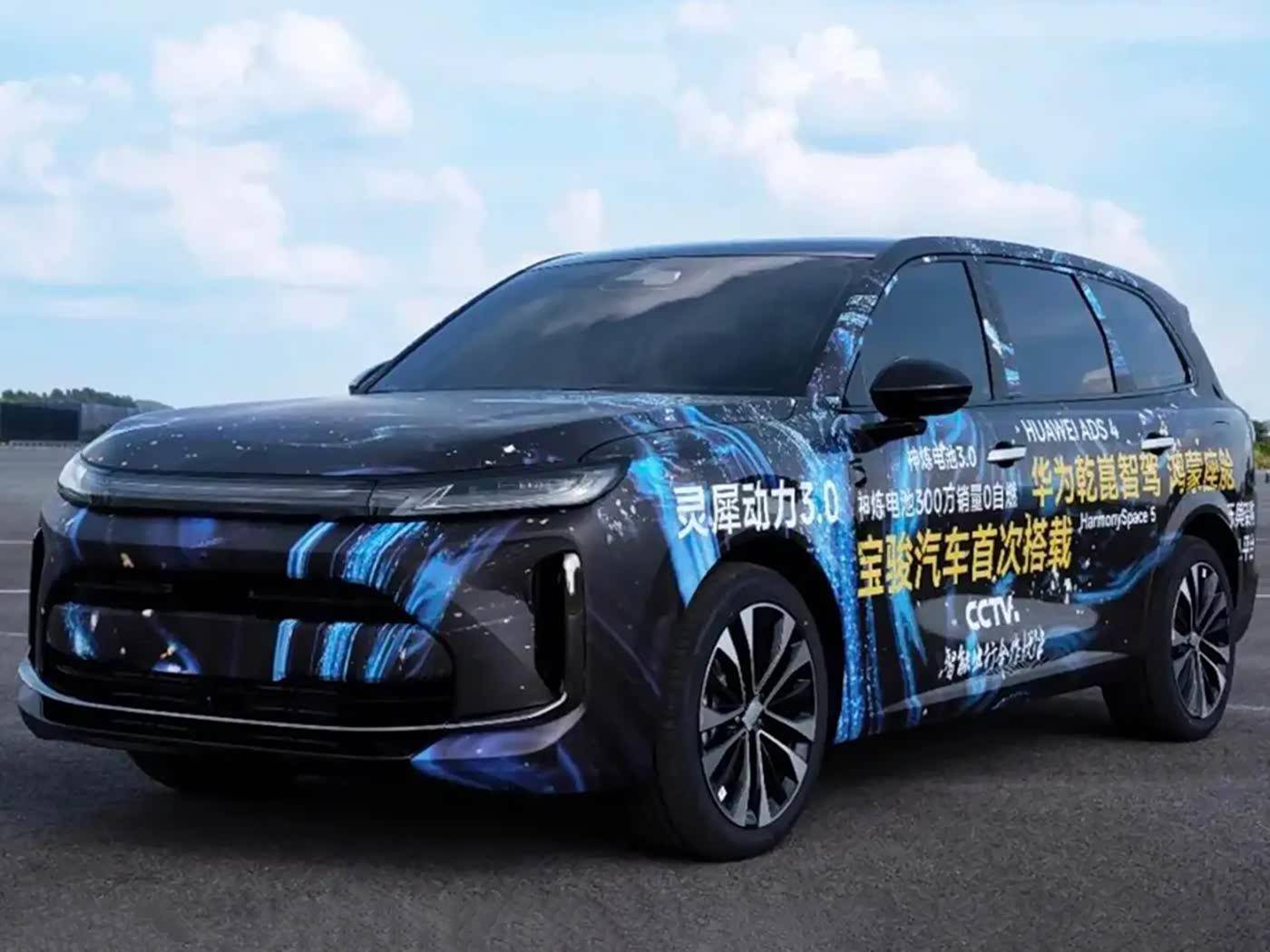 车侧造型比较板正,由此也能看出它的定位是家用和空间,不过更大的看点还是车上的标语,可以看到它配备了华为乾崑智驾HUAWEI ADS 4,采用纯视觉方案,考虑到价格也能理解。另外还有鸿蒙座舱,不过内饰暂时还没图片。尺寸方面,新车的长宽高分别为5235/1999/1800mm,轴距3105mm。