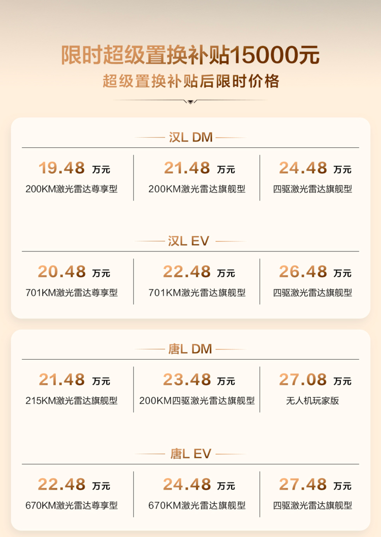 原因是比亚迪将两款车型的售价进行了调整,汉L DM的起售价格来到了19.48万元,唐L DM的起售价格则是20.48万元(超级置换补贴后售价),降低了消费者的购买门槛。