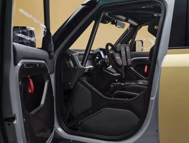 值得关注的是,该车进行了一系列必要的改装:前格栅尺寸加大,轮眉向外扩展,A柱两侧配备了双尾喉,车顶加装射灯系统。底盘部分换装了专属的35英寸越野轮胎,搭载高性能Bilstein减震器,制动系统升级为前六活塞和后四活塞卡钳。为减轻重量,设计师移除了车尾的备胎。