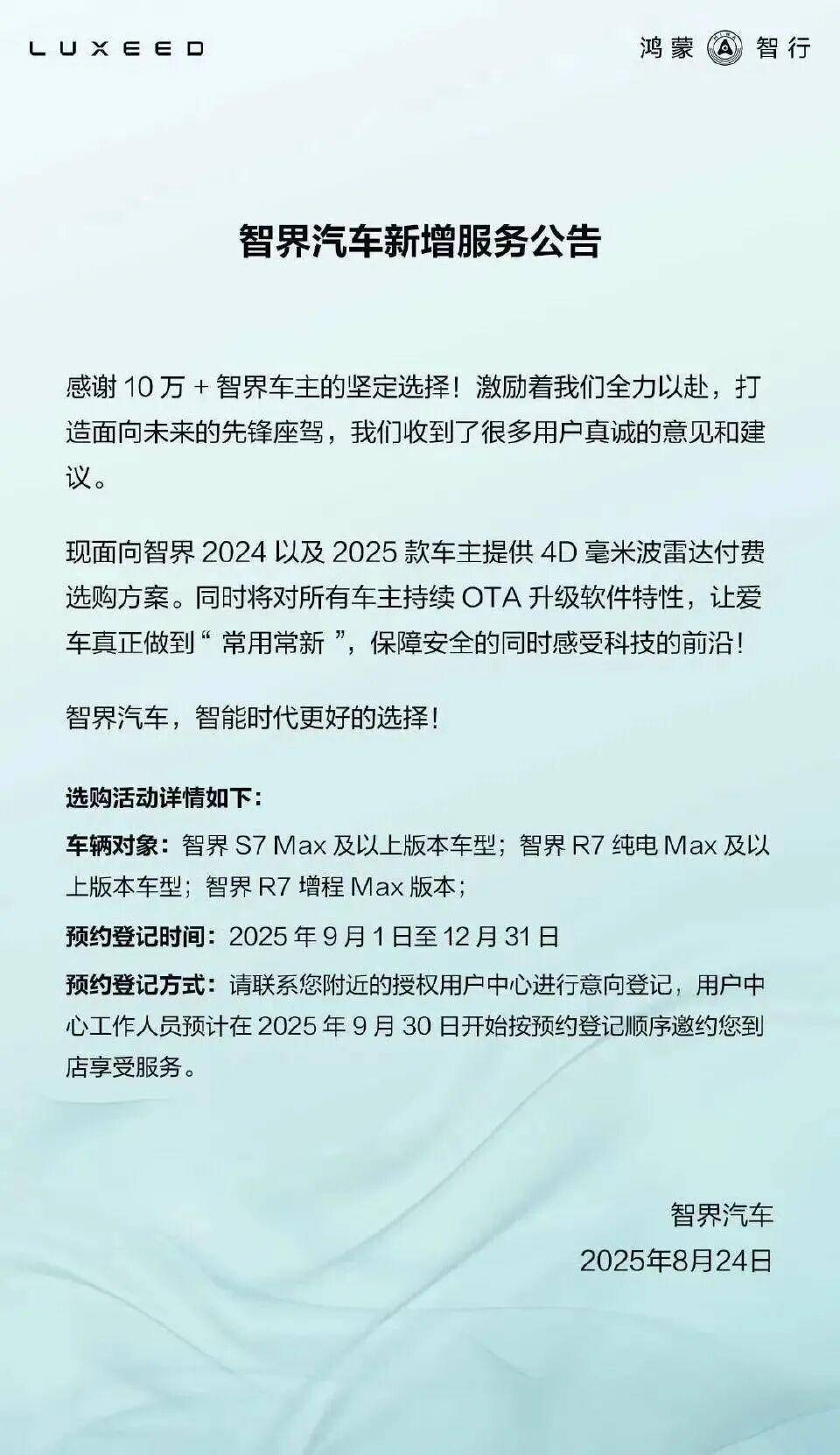 2025年8月,智界R7为车主提供4D毫米波雷达的付费升级方案;紧接着的是,2025年10月,问界汽车为2024款问界M9用户推出了华为ADS小蓝灯的付费升级服务。
