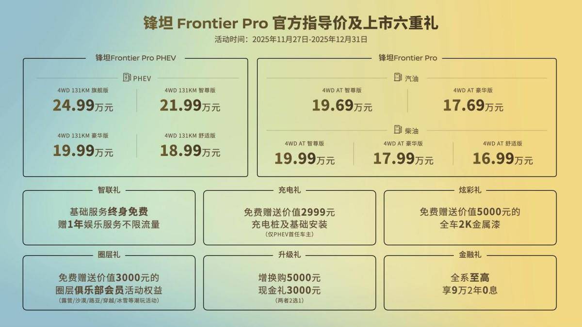 发布会上,郑州日产公布了锋坦的官方售价:锋坦Frontier Pro售价区间16.99万元-19.99万元,锋坦Frontier Pro PHEV售价区间18.99万元-24.99万元。为回馈用户支持,郑州日产还同步推出“智联礼、充电礼、炫彩礼、圈层礼、升级礼、金融礼”尊享6重礼,助力广大用户轻松购、放心开。