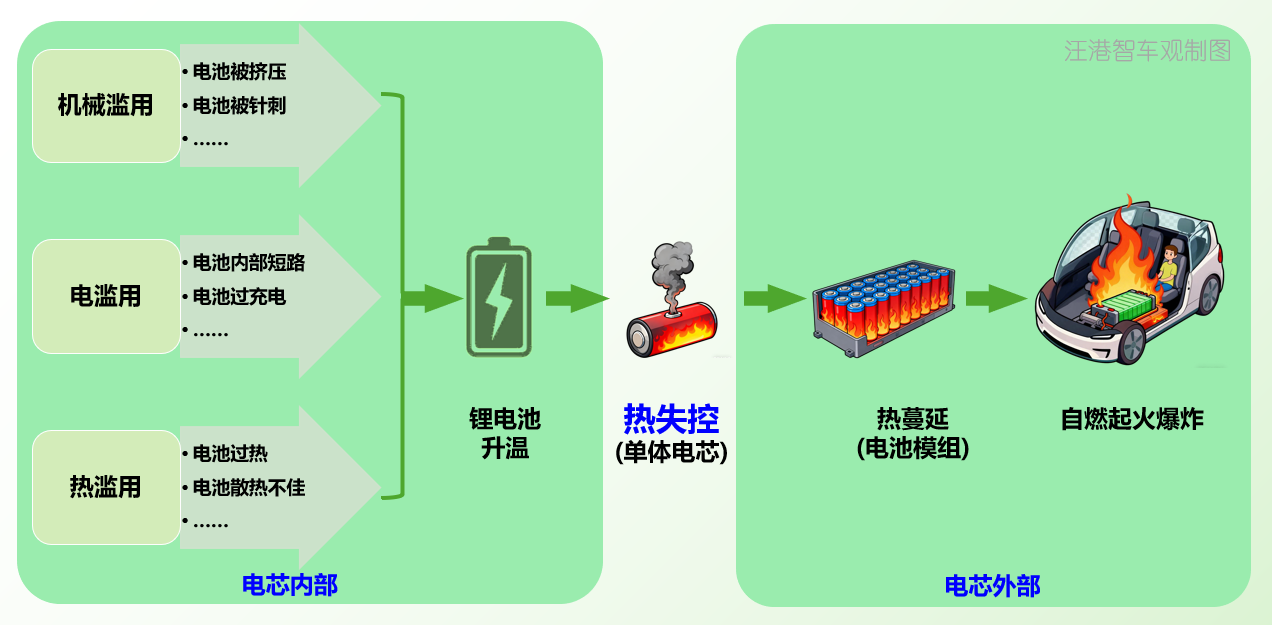 这里延展解读一下,在我看来,热失控是所有电池安全事件的临界点,热失控之前,在电芯内部,有机械滥用、电滥用、热滥用等多种原因使得锂电池升温,进而引发热失控,这是单体电芯的不可逆热灾难;而热失控如果处理不当,便会进一步的延伸出电池模组级的热蔓延,这是从单体到整包的连锁反应;此时如果还无法控制住的话,自燃、起火、爆炸等事故便会接踵而来!